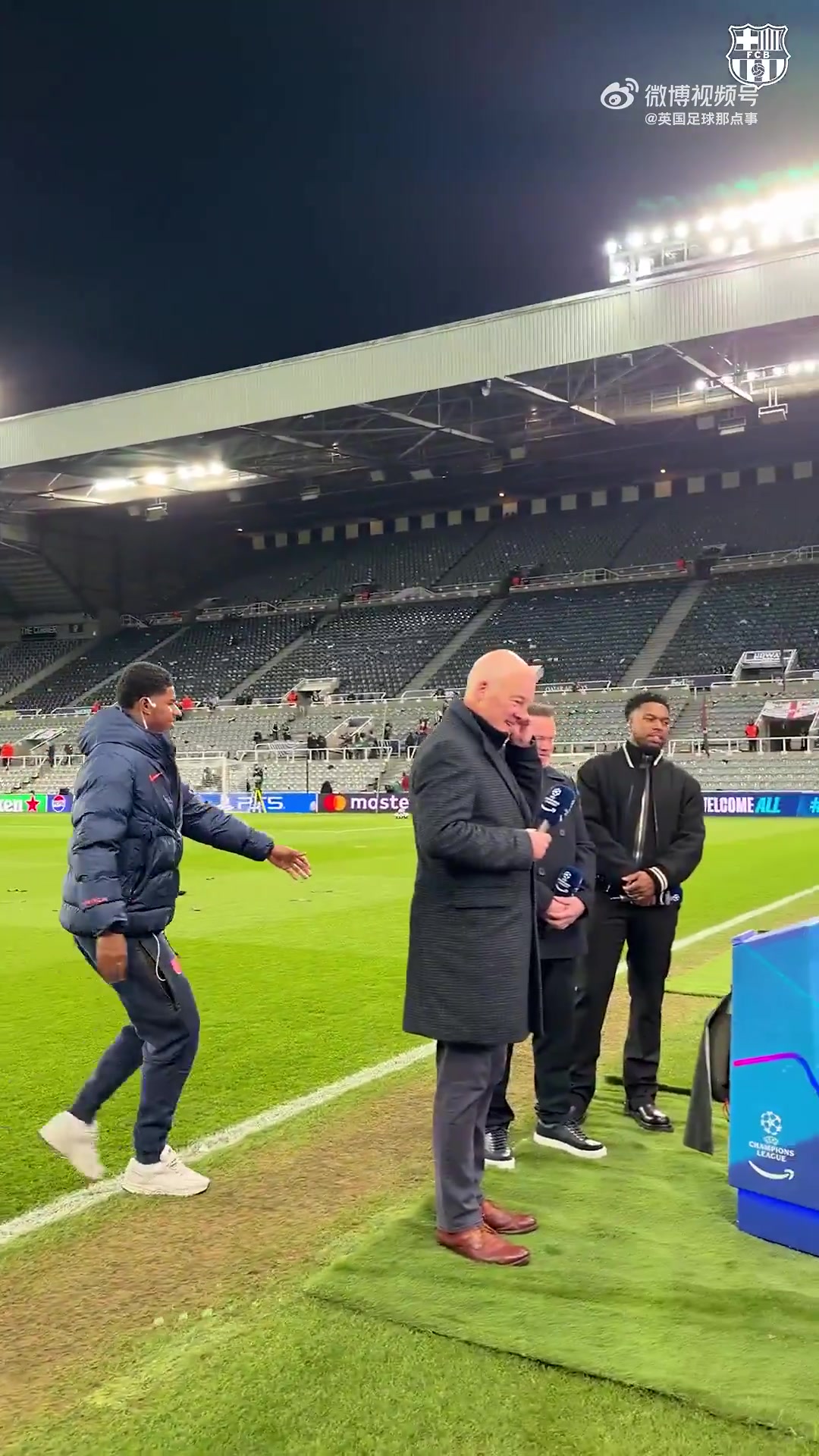 巴萨vs纽卡赛前,拉什福德特意去和场边的鲁尼以及斯图里奇打招呼