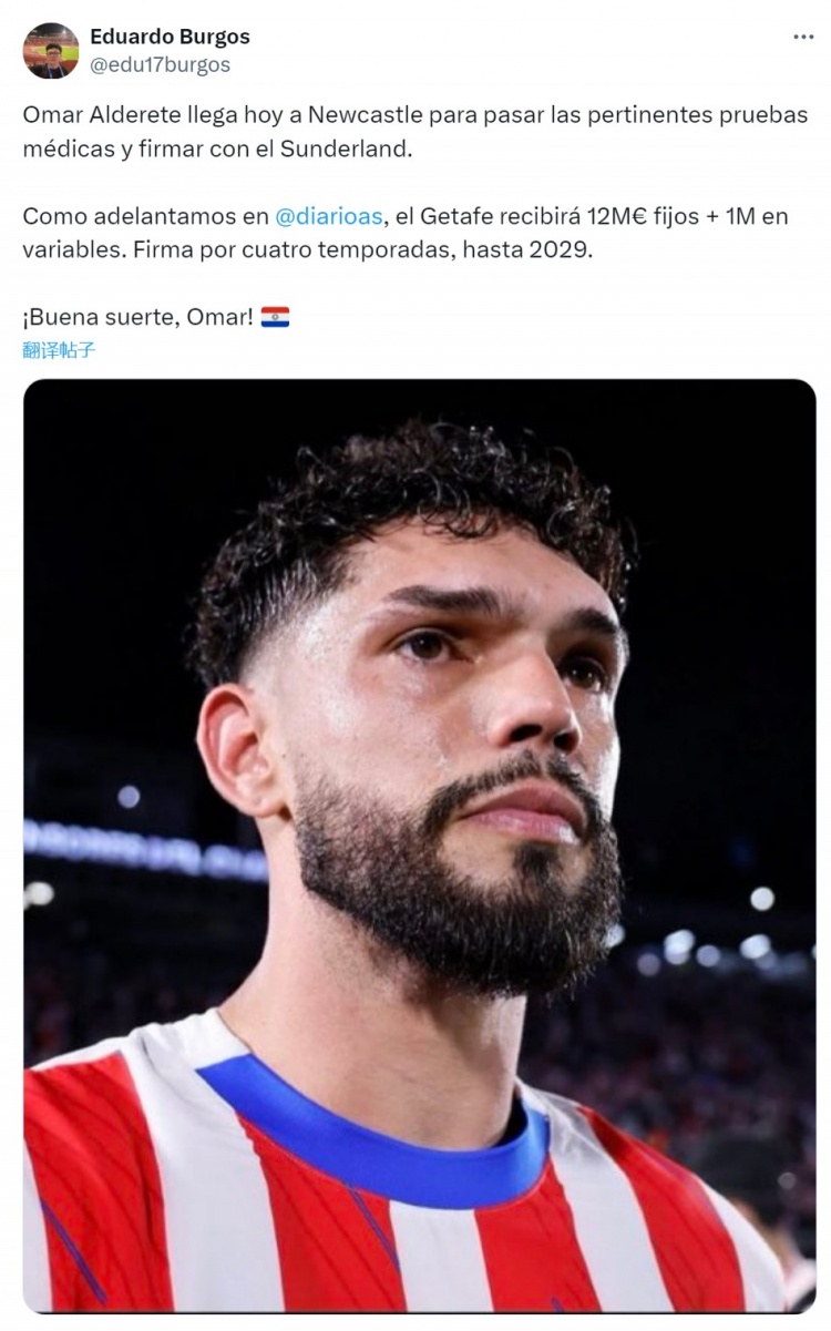 Eduardo Burgos暴露,阿德雷特今天抵达纽卡斯尔,剿袭桑德兰的体检,并与英超升班马签约至2029年,转会费1200万欧+100万欧浮动。