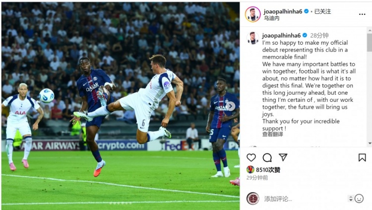 帕利尼亚此役为热刺首发出战,献艺热刺生计阐发比赛首秀,赛后他在外交媒体上写谈:“我格外欢笑在这场牢记的决赛中,代表这家俱乐部献艺阐发比赛首秀!”