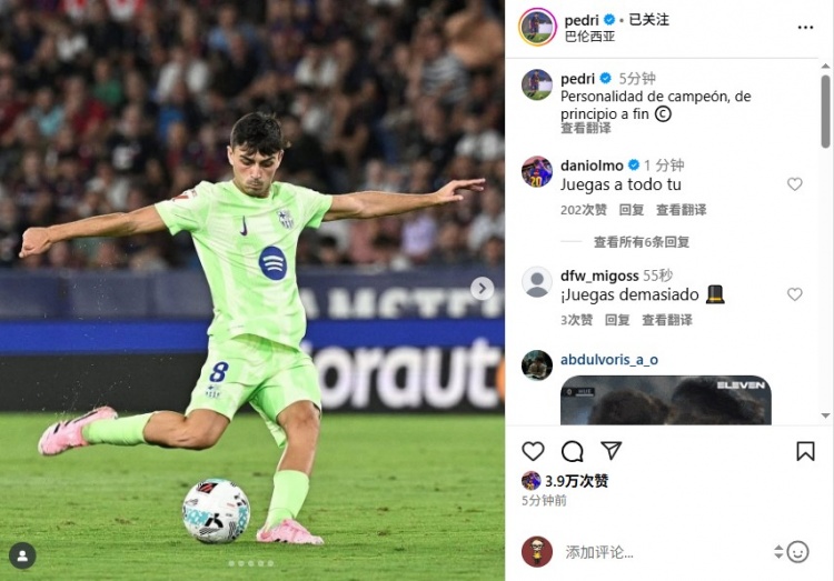 8月24日讯 佩德里今天更新Instagram,晒出赛场照。