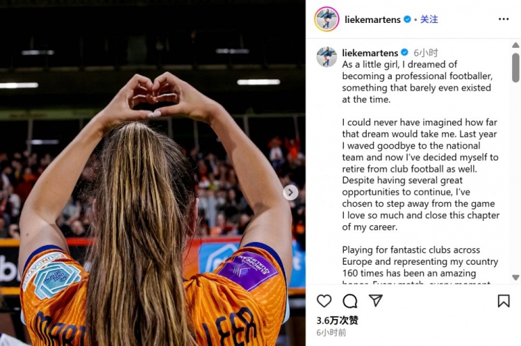 9月2日讯 荷兰女足的32岁时尚列克-马滕斯通过社媒发文,晓示退役。她曾遵守过巴萨和巴黎在内的多家欧洲俱乐部,并随荷兰女足得回2017年欧洲杯冠军和2019寰球杯亚军,她也当选为已往的寰球足球姑娘。