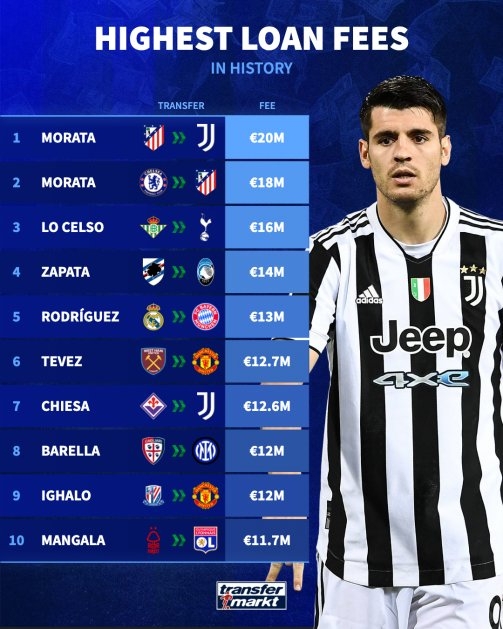 1、莫拉塔 马竞→尤文 2000万欧 (*租期2个赛季)