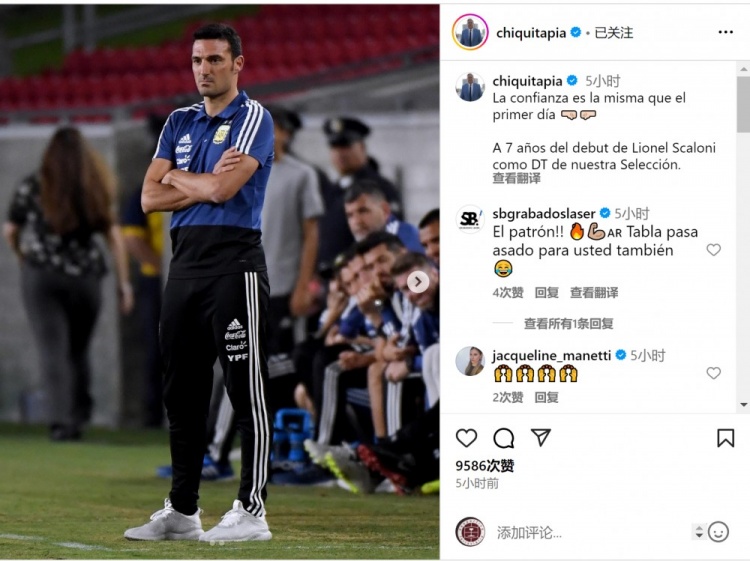 阿根廷足协主席塔皮亚社媒晒出斯卡洛尼的相片,配文:“信心依旧如初🤜🏻🤛🏻斯卡洛尼当作咱们国度队主帅初度亮相七周年。”