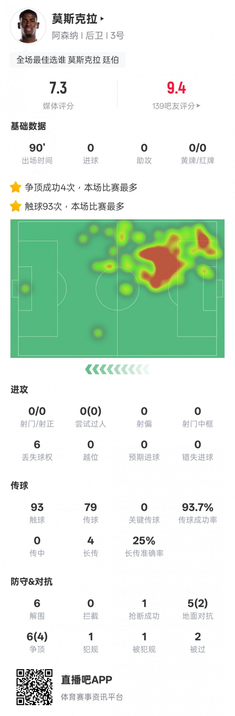 9月17日讯 欧冠联赛阶段第1轮,阿森纳客场2-0毕尔巴鄂竞技。莫斯克拉首发出战,93次触球全场最多,还有6次突围和4次争顶奏效,评分7.3。