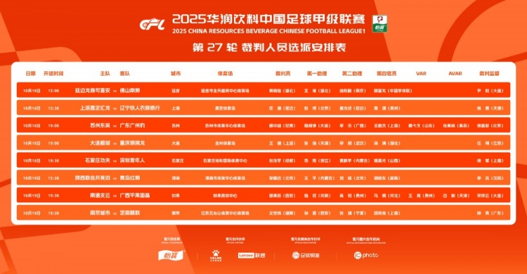 10月18日讯 2025华润饮料中甲联赛第27轮裁判遴派恶果公布,其中苏州东吴vs广东广州豹、南通支云vs广西平果两场焦点战争安排有VAR裁判。