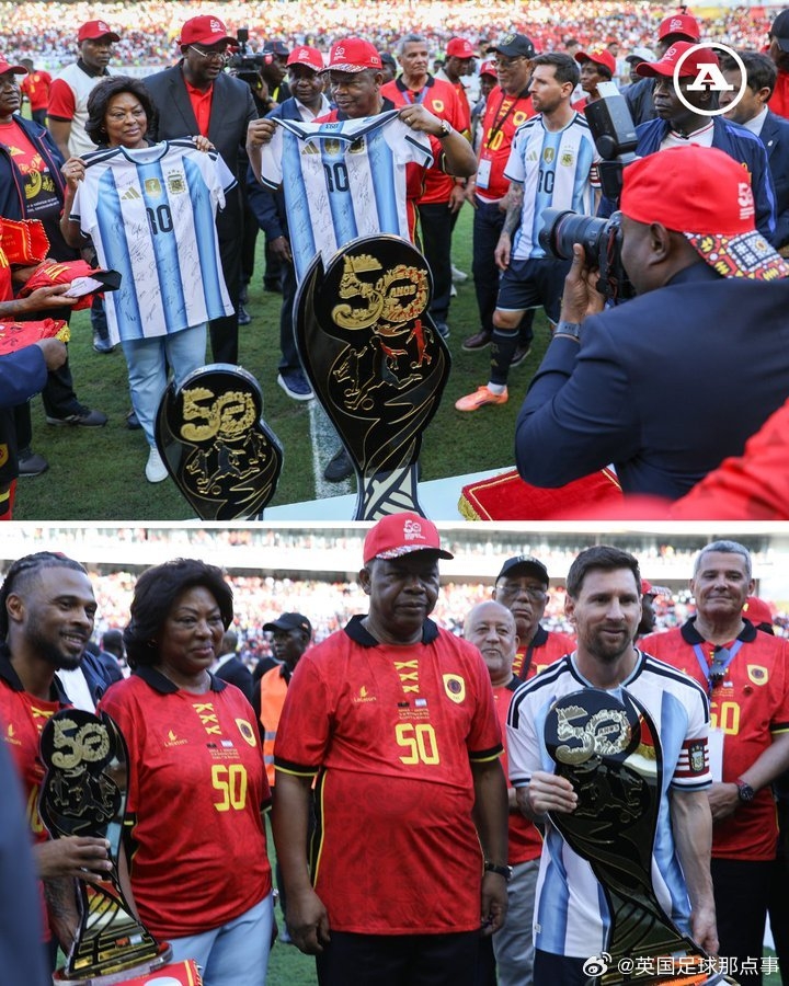 阿根廷与安哥拉比赛前,梅西将球衣赠予安哥拉总统,总统回赠他一座顾忌安哥拉独处50周年的十分奖杯。