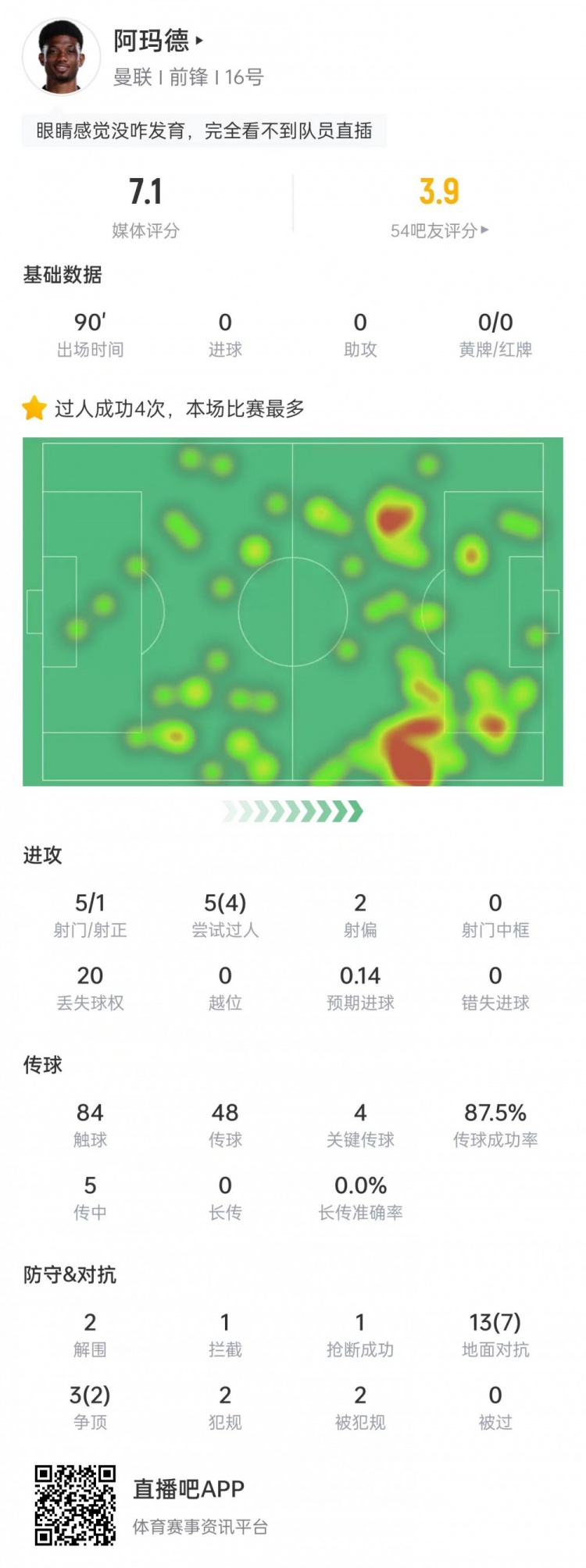 11月25日讯 英超第12轮比赛,阿玛德踢满全场,曼联0-1不敌埃弗顿。