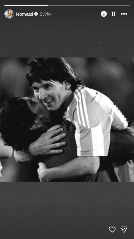 11月26日讯 梅西更新社媒,晒出他与马拉多纳拥抱的相片,吊唁马拉多纳死亡5年。