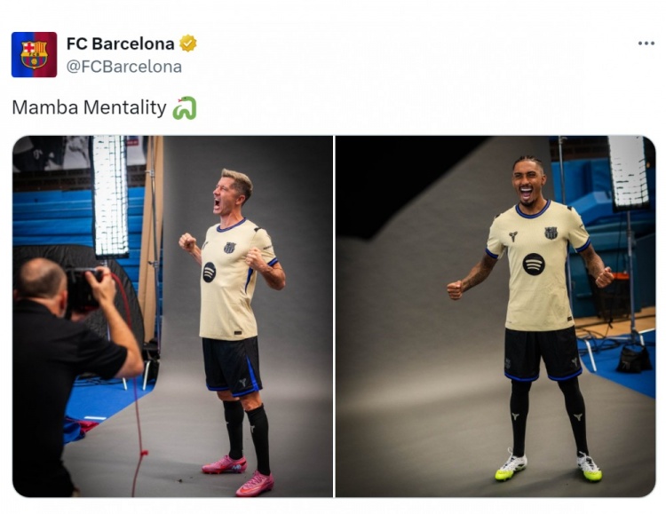 巴萨官方社媒晒出莱万、拉菲尼亚身穿科比联名球衣定妆像片,配文:“曼巴精神。”
