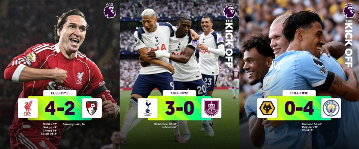 08月18日讯 新赛季英超首轮基本截至,传统BIG6的比赛齐还是打完,其中利物浦4-2伯恩茅斯、曼城4-0狼队、热刺3-0伯恩利、切尔西0-0水晶宫、阿森纳1-0曼联。
