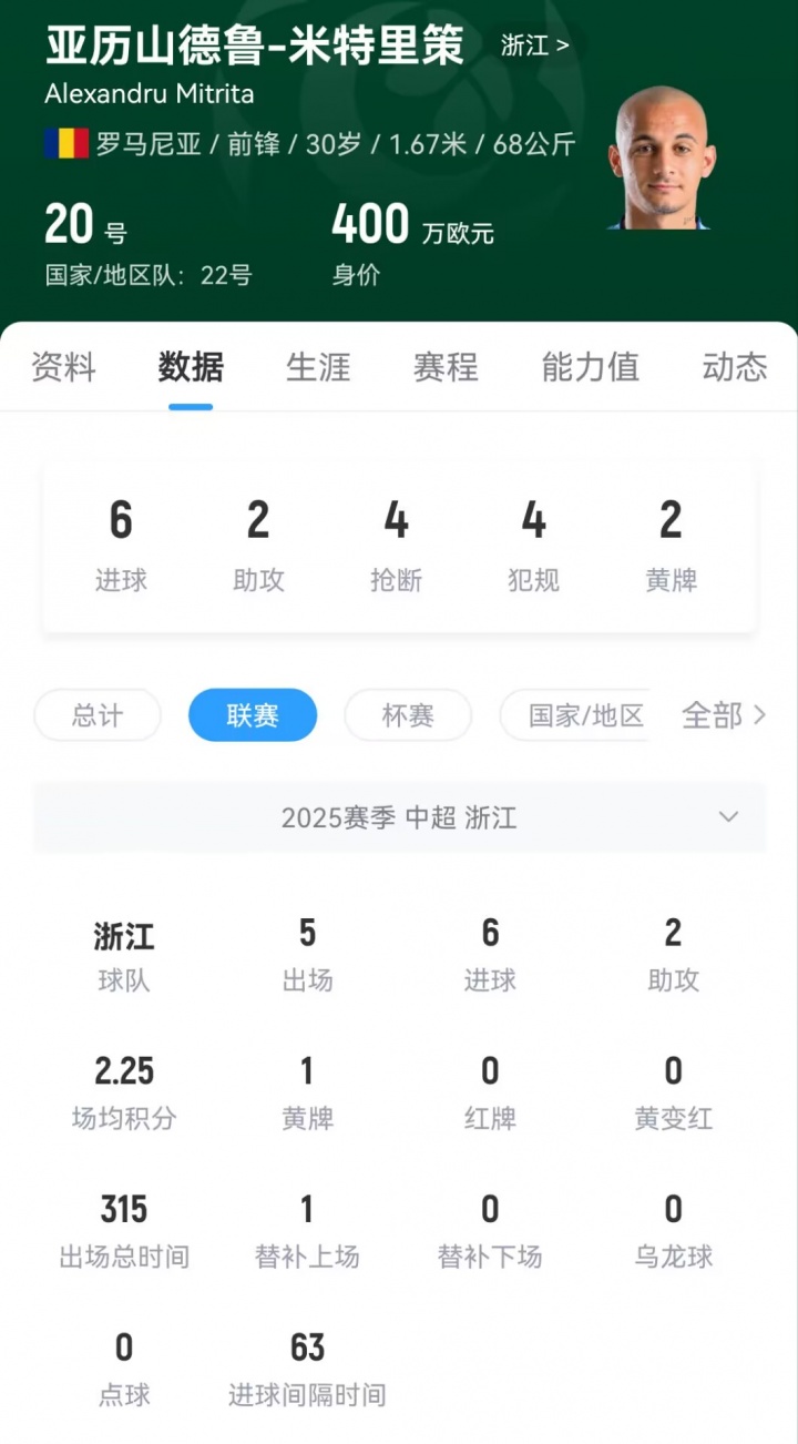 加盟浙江队以来,米特里策在为球队出战的5场中超内已孝顺了惊东谈主的6球2助,首秀对阵青岛海牛的比赛中就演出了2球1助的好戏。