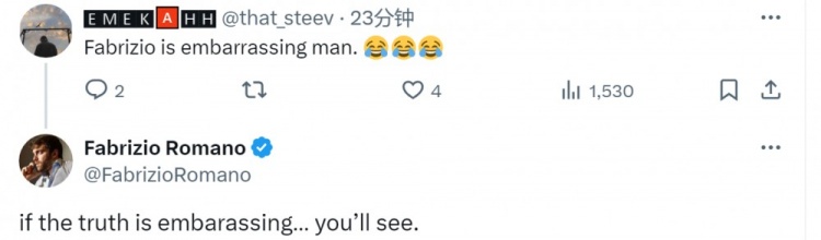 8月27日讯 有球迷就加纳乔转会停淹留言嘲谑罗马诺,后者回复称“等着瞧”。