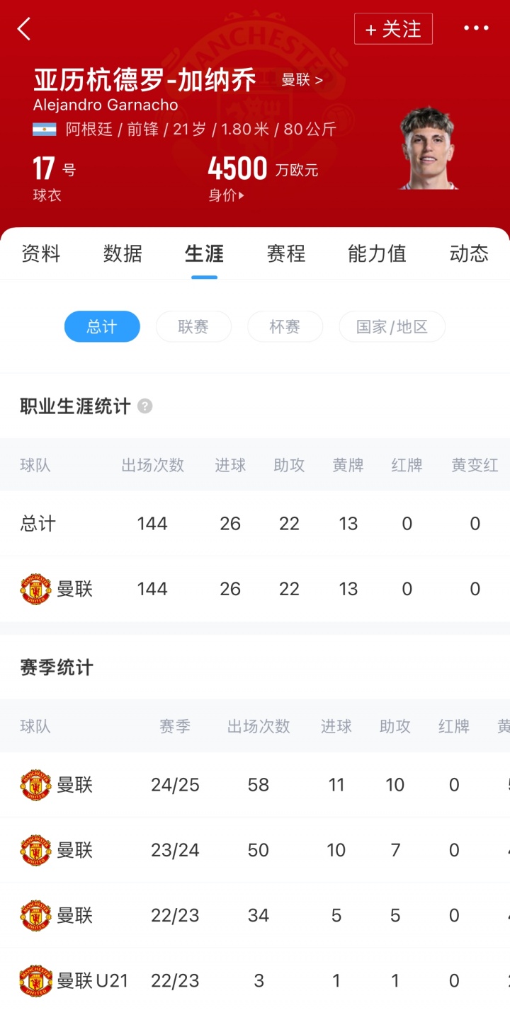 加纳乔现年21岁,阿根廷前卫,与曼联的现存合同将在2028年到期,现德转估值为4500万欧。上赛季,加纳乔为曼联出场58场,赢得11粒进球和10次助攻。