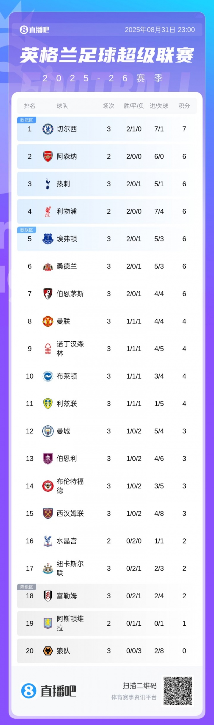 08月31日讯 英超第3轮截止了大部分比赛的较量,最新积分榜如下