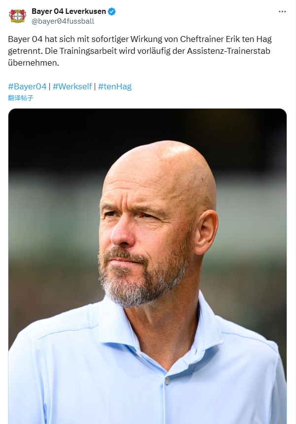 勒沃库森官方:即日起撤废埃里克-滕哈赫主素质职务,考试职责暂由助理素质团队继承。