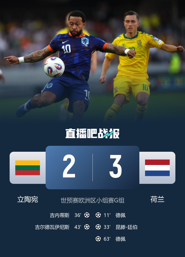 4轮不败领跑!荷兰3-2立陶宛 德佩梅开二度+加冕荷兰队史弓手王