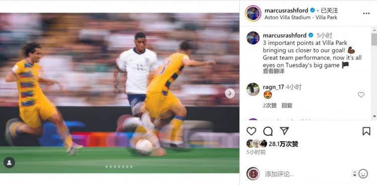 拉什福德社媒晒出比赛相片,配文:“在维拉公园球场拿下迫切三分,让咱们更接近运筹帷幄!球队进展出色,当今专注于周二的迫切比赛(客战塞尔维亚)!”