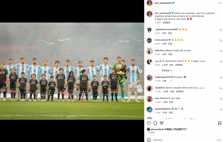 本场比赛门将马丁内斯首发出战,赛后他在个东谈主社媒晒出全队合照,配文写谈:“这场比赛让东谈主气忿,但所以第一的收货完成预选赛令东谈主自豪,让咱们络续前进,好戏就要演出了。”