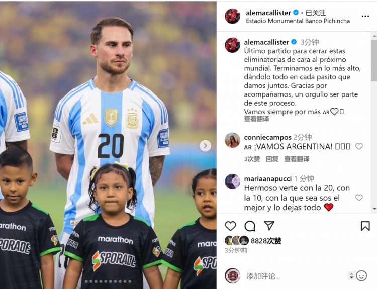 阿根廷中场麦卡利斯特在酬酢媒体上写谈:“临了一场比赛为本次天下杯预选赛画上句号。咱们以榜首位置收官,在共同迈出的每一步中倾尽全力。感谢你们的陪同,能参与其中是我的运气。咱们历久追求更多。”