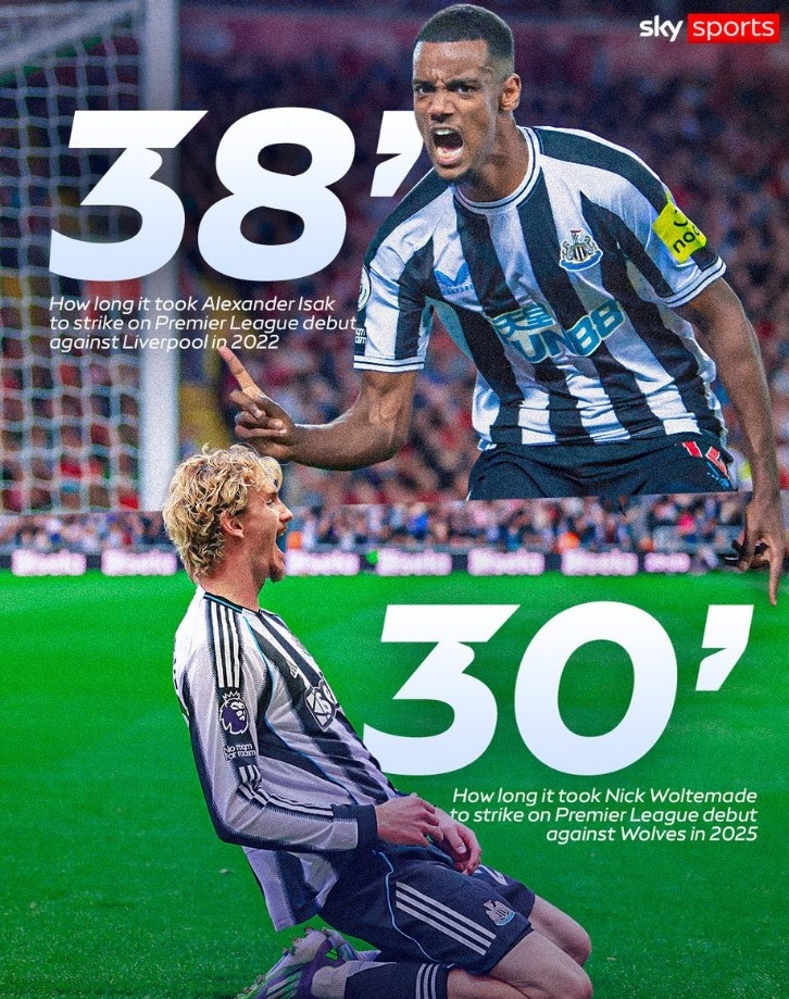 值得一提的是,纽卡上一位神锋伊萨克在纽卡首秀的第38分钟也很快获得进球,敌手是新东家利物浦。