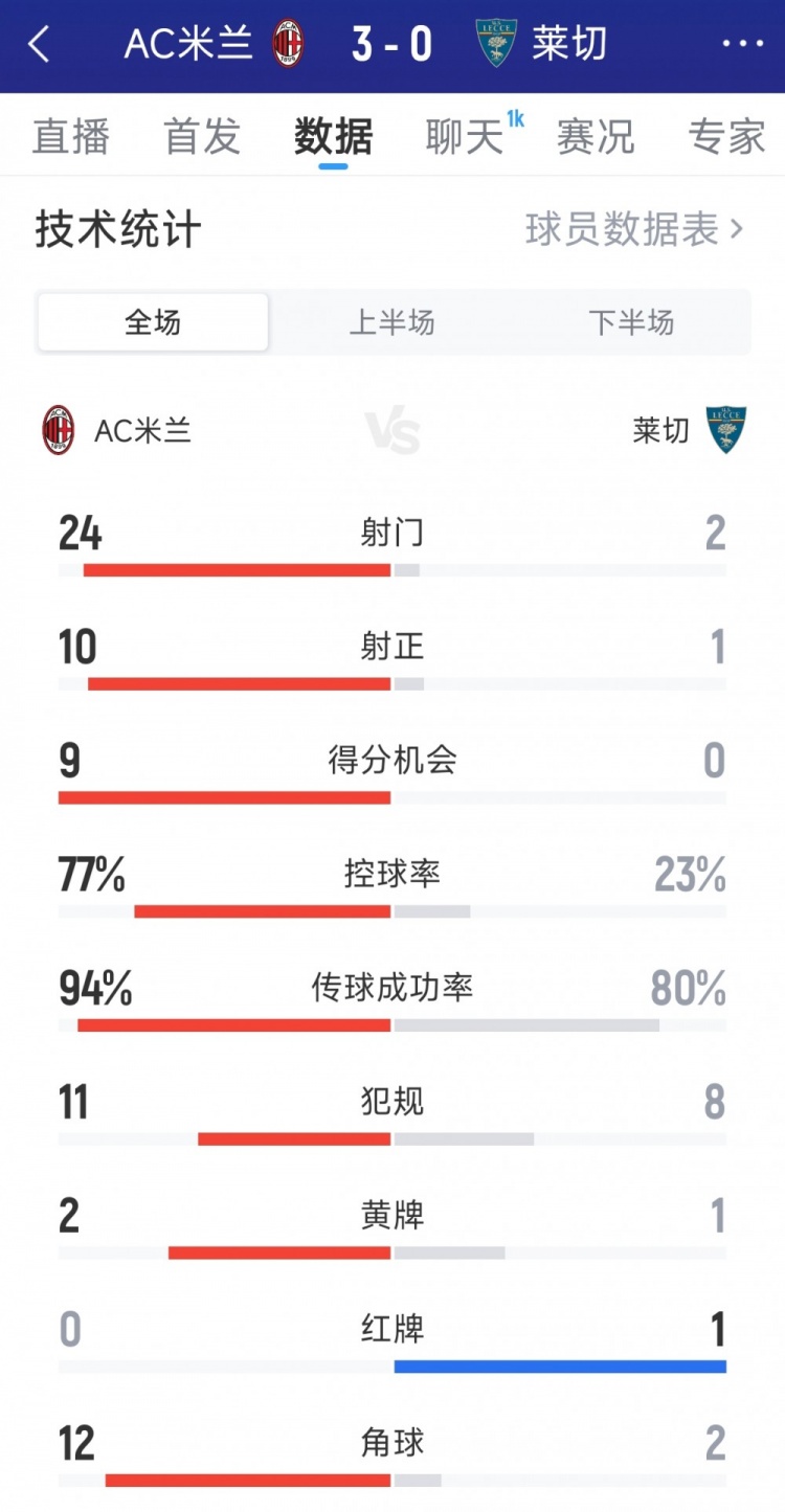 9月24日讯 在本轮意大利杯第2轮,AC米兰3-0完胜莱切,以下为两边全场数据对比: