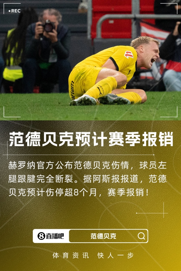 9月26日讯 赫罗纳官方晓谕范德贝克伤情,范德贝克左腿跟腱齐备断裂.《阿斯报》报谈,赫罗纳中场范德贝克瞻望将伤停超8个月,本赛季报销。