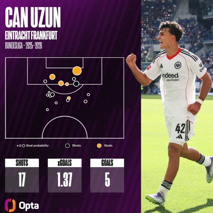 9月30日讯 本赛季法兰克福19岁小将乌尊景况出色,聚合5场德甲破门,5场比赛5球3助攻。