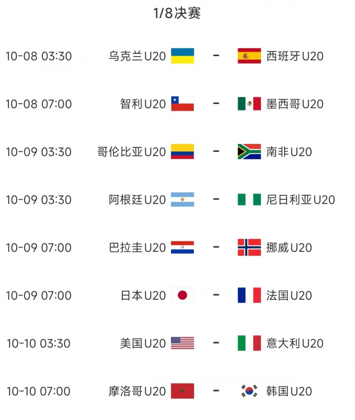10月06日讯 世青赛(U20宇宙杯)16强一都出炉,对阵情况也随之一都揭晓。16强比赛将从10月8日运转进行。
