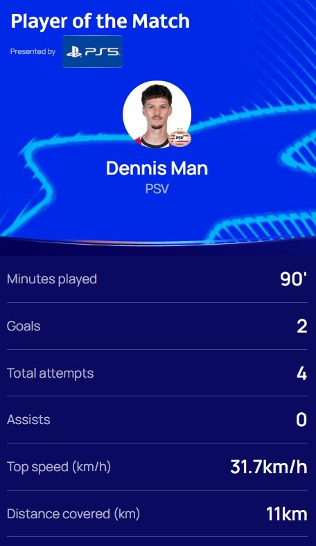 本场比赛埃因霍温球员丹尼斯-曼透流露色,梅开二度,4次射门,跑动距离达到11km,赛后他也当选欧冠官方评比出的本场最好球员。