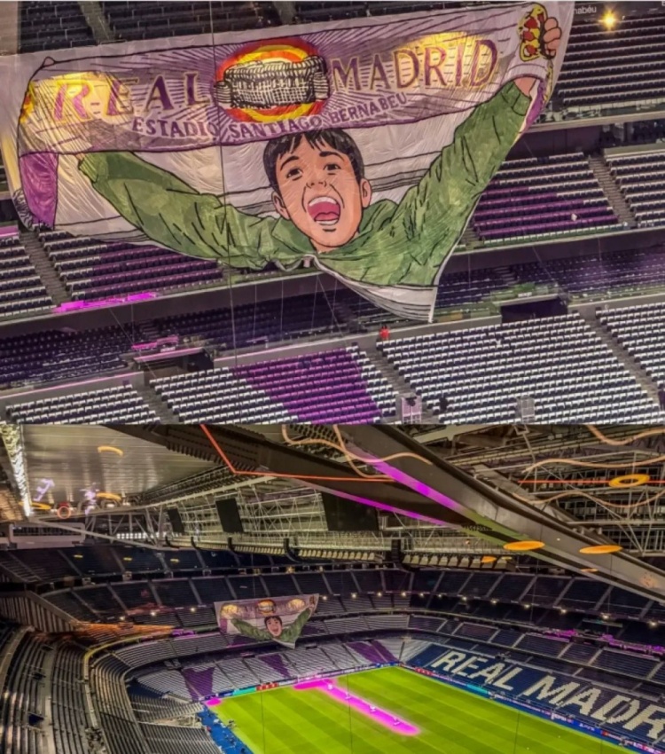 TIFO骨子为巴斯克斯2017年在国度德比之前社媒发布的相片,少年工夫的巴斯克斯高举皇马领巾。