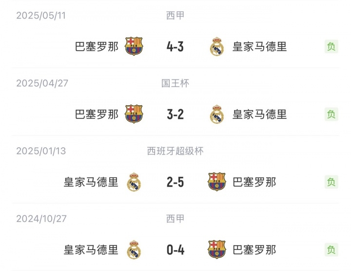 上赛季,皇马在西甲、国王杯和西超杯四次对阵巴萨,遭逢四连败。