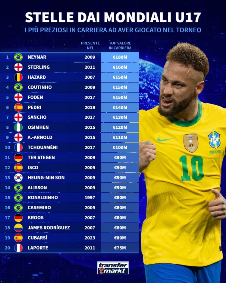 11月15日讯 德转列出了曾进入U17天下杯球员最高身价名次,内马尔1.8亿欧居首,斯特林1.6亿欧次席。
