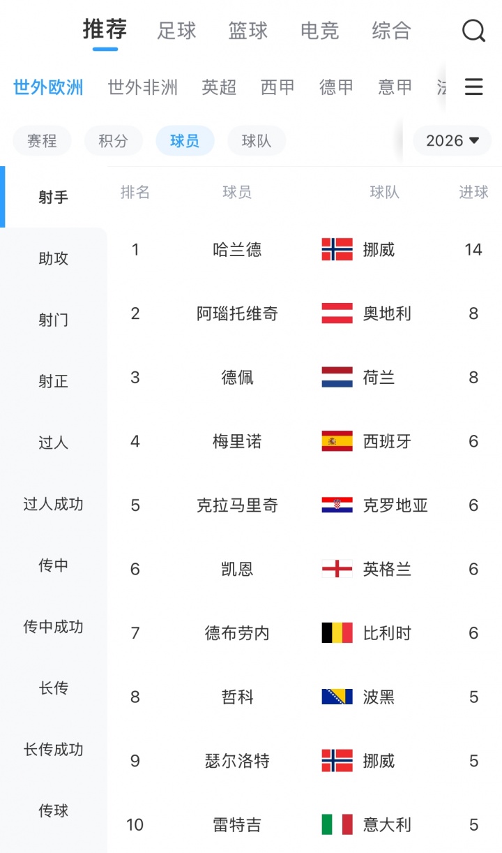 世初赛欧洲区现在的弓手榜,哈兰德14球断层领跑。他也基本笃定拿下金靴。