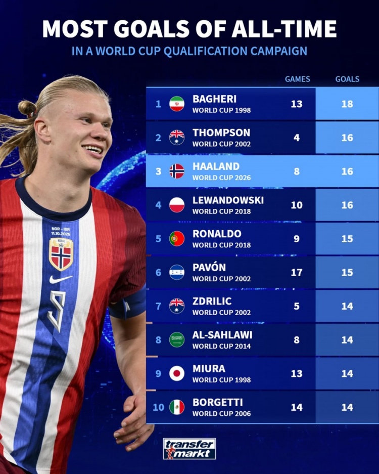 2026年寰球杯预选赛——哈兰德(挪威)——8场16球