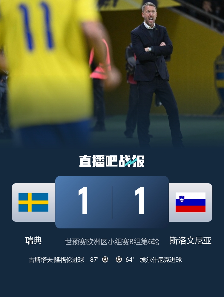 瑞典战平斯洛文尼亚,最终瑞典排行小组垫底,将凭借欧国联的保底履历投入世欧预附加赛。