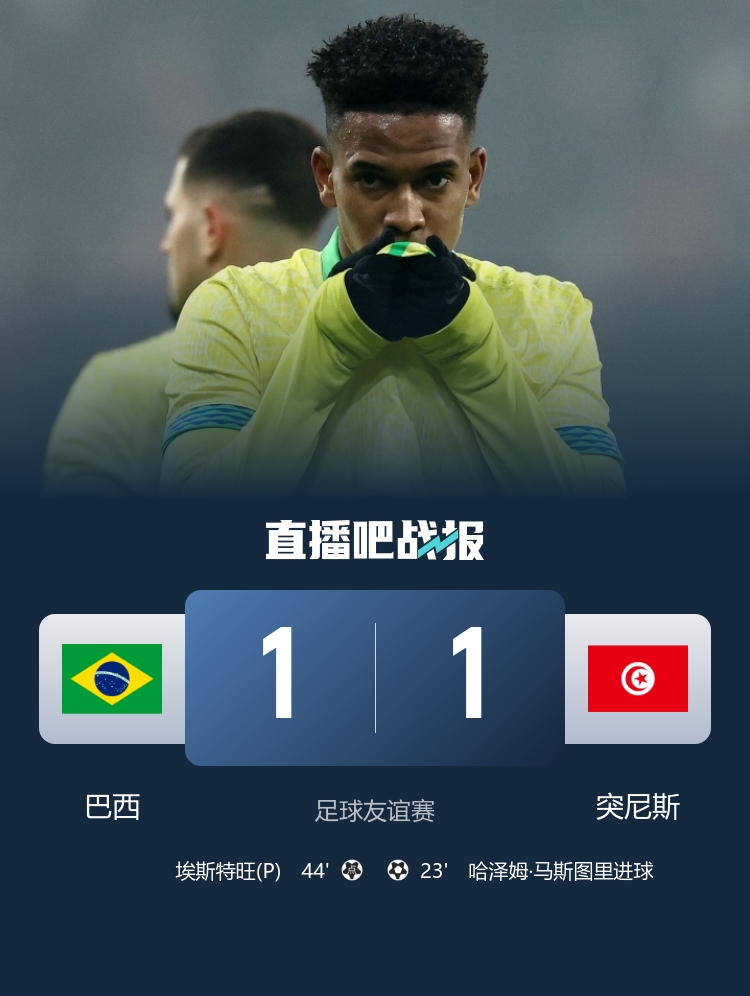 友谊赛对阵,巴西1-1战平突尼斯,埃斯特旺本场点射立功,值得暖和的是米利唐在这场友谊赛受伤了。