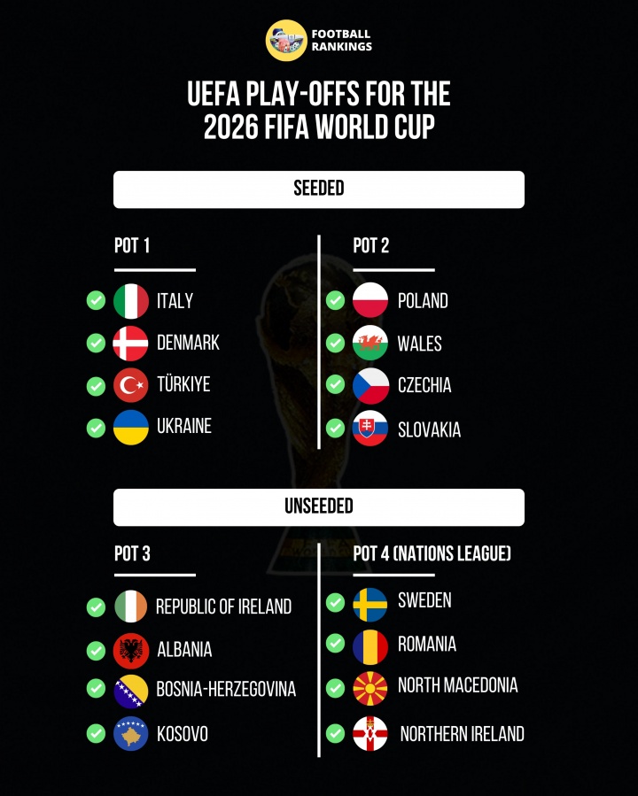 世欧预附加赛分档出炉:意大利丹麦1档,波兰2档瑞典4档