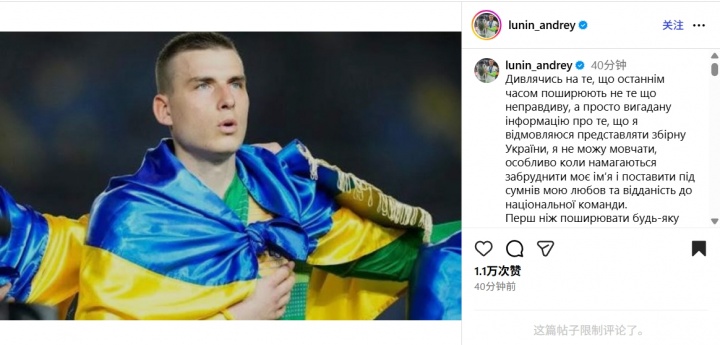 皇马门将卢宁发布社媒,关于相干我方间隔为乌克兰出场比赛的报谈进行辟谣,并称我方不成能间隔为国度出战。