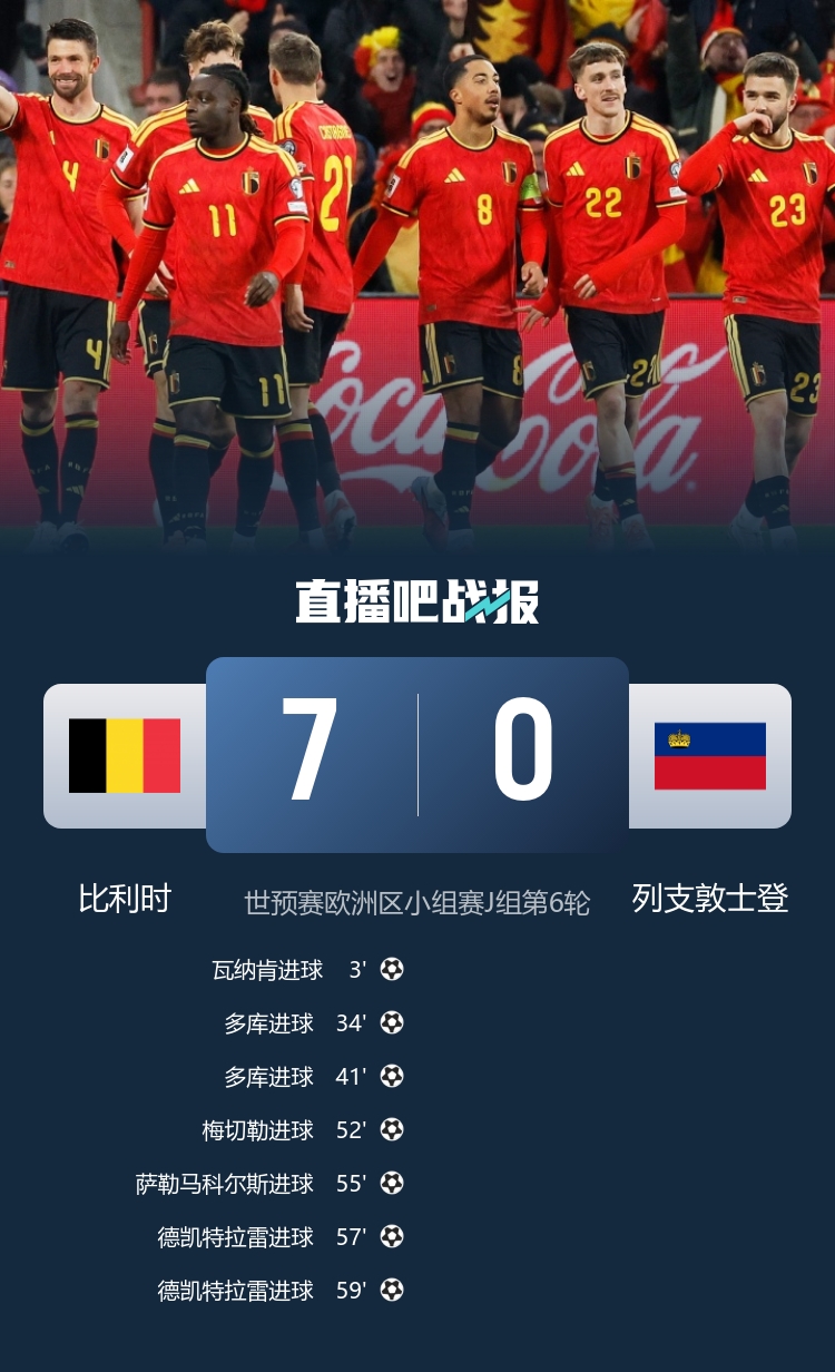 比利时7-0列支敦士登,欧洲红魔以摧枯折腐之势大捷晋级寰球杯。