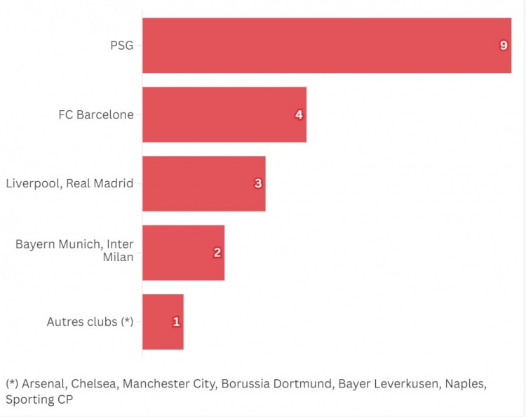 在2025年金球奖的30名提名者中,有9名球员来自巴黎圣日耳曼俱乐部。这一数字追平了皇家马德里在2003年(当时提名名单为50人)和2018年的纪录。