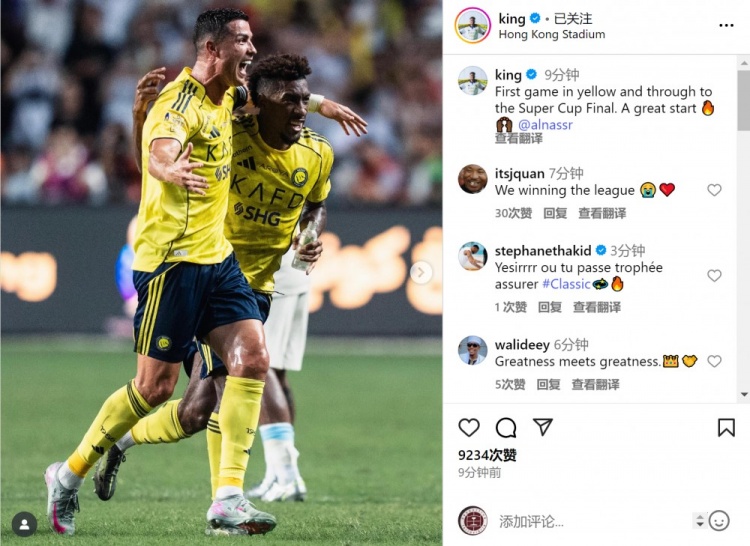 科曼社媒晒出与C罗一起庆祝的照片,配文:“身披黄色战袍的首场比赛,晋级沙超杯决赛,很棒的开始!”