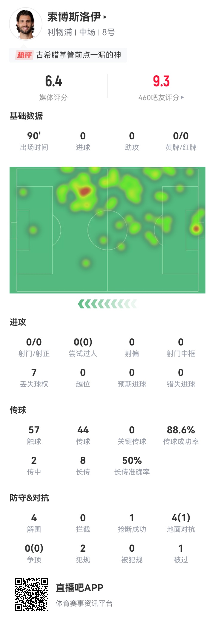 由于弗林蓬受伤,加上布拉德利刚刚伤愈复出不敢贸然首发,斯洛特本场没有正印右边后卫,他选择使用索博斯洛伊客串。索博也用出色的发挥回应了主帅的信任。从热区图上看,他的活动范围覆盖了利物浦这个右半区。