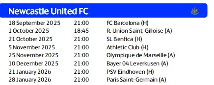 8月30日讯 欧足联官方公布了新赛季欧冠联赛阶段赛程,纽卡赛程如下: