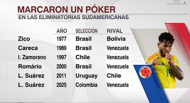 9月10日讯 在本轮南美区世预赛哥伦比亚6-3击败委内瑞拉的比赛中,苏亚雷斯上演大四喜,成为赛事历史第6位做到这一点的球员,具体如下:
