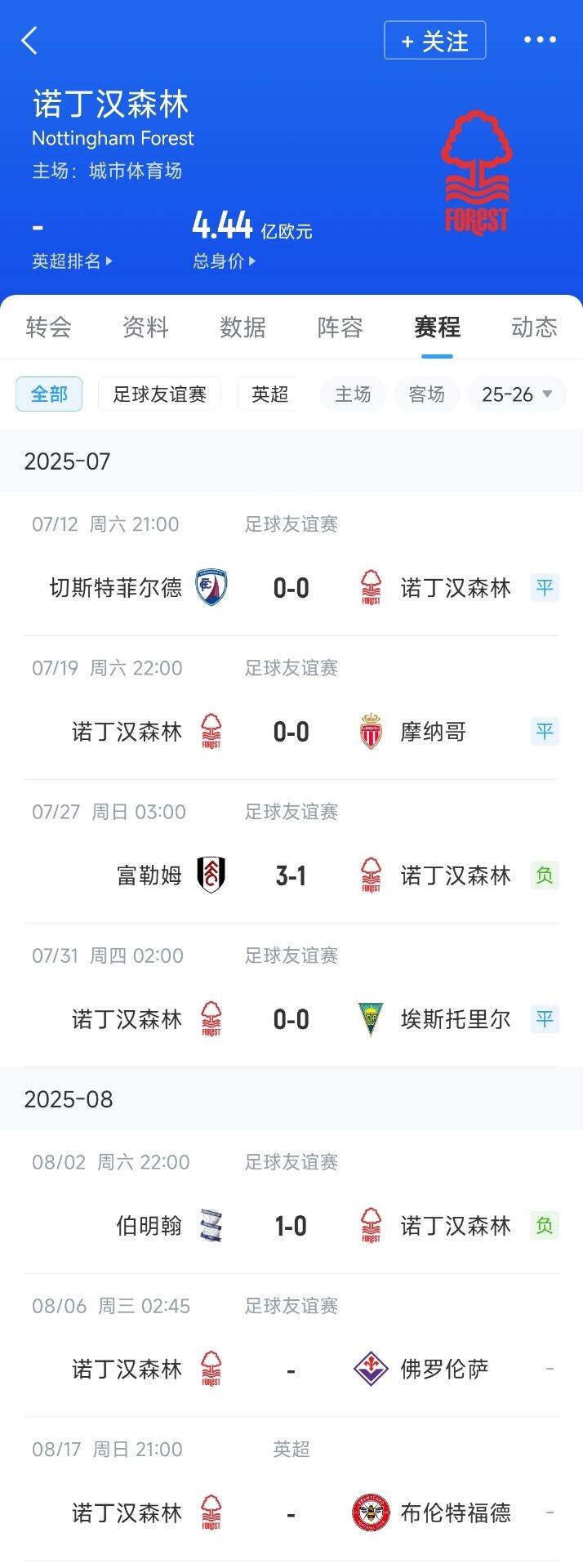08月03日讯 英超的诺丁汉森林季前赛5场1场也没赢,3平2负只进了1个球。