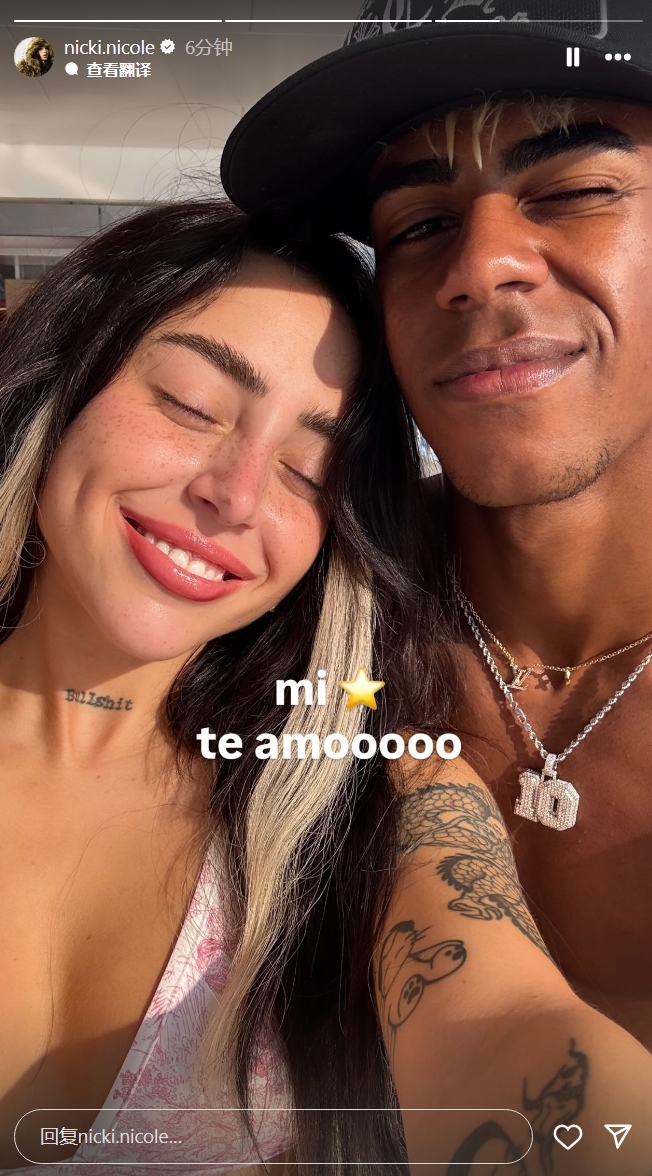 Nicki Nicole晒出了自己与亚马尔的亲密合照,配文写道:“我爱你。”