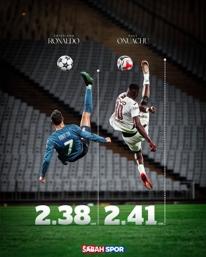 身高2.01米的奥努阿楚,日前打进一粒精彩的倒钩进球,触球点高度达2.41米。当年C罗的天秀倒钩触球点高度为2.38米。