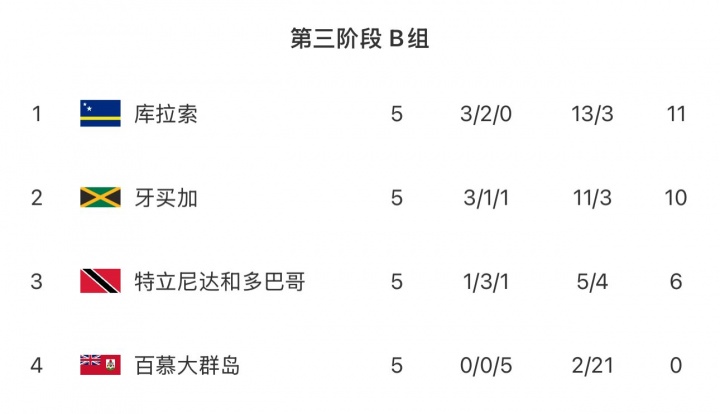 11月14日讯 北美预选第三阶段第5轮, 库拉索客场7-0狂胜百慕大群岛,牙买加客场1-1遭特立尼达和多巴哥绝平。