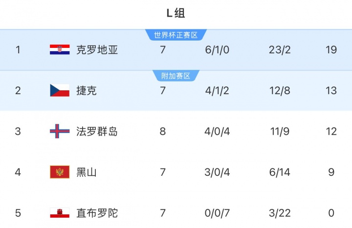 11月16日讯 世预赛欧洲区小组赛L组第9轮,法罗群岛1-3客负克罗地亚,8场小组赛结束后已确定无法进入前二,无缘2026美加墨世界杯。