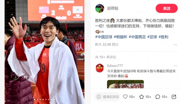 在个人社媒,胡荷韬写道:胜利之夜🙌🏼大家伙都太棒啦,齐心协力就能战胜一切!也感谢球迷们的支持,下场继续拼,雄起!👊🏼🇨🇳